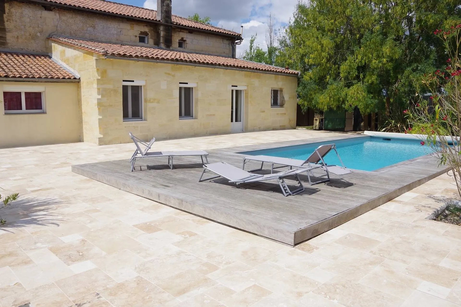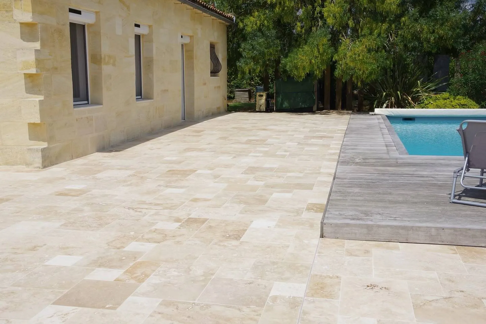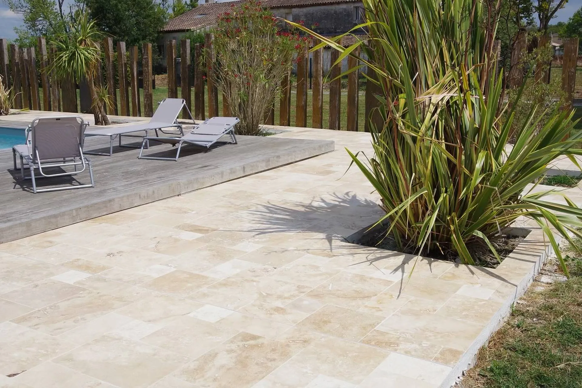 Sur ce nouveau chantier, le Travertin rustique en Opus 4 formats a été posé sur l’ensemble du pourtour de la maison, autour de la piscine, sur la terrasse entière ainsi qu’autour des zones de plantation. Le résultat est tout simplement magnifique : un extérieur harmonieux, chaleureux et naturel, à l’image des plus belles réalisations paysagères.