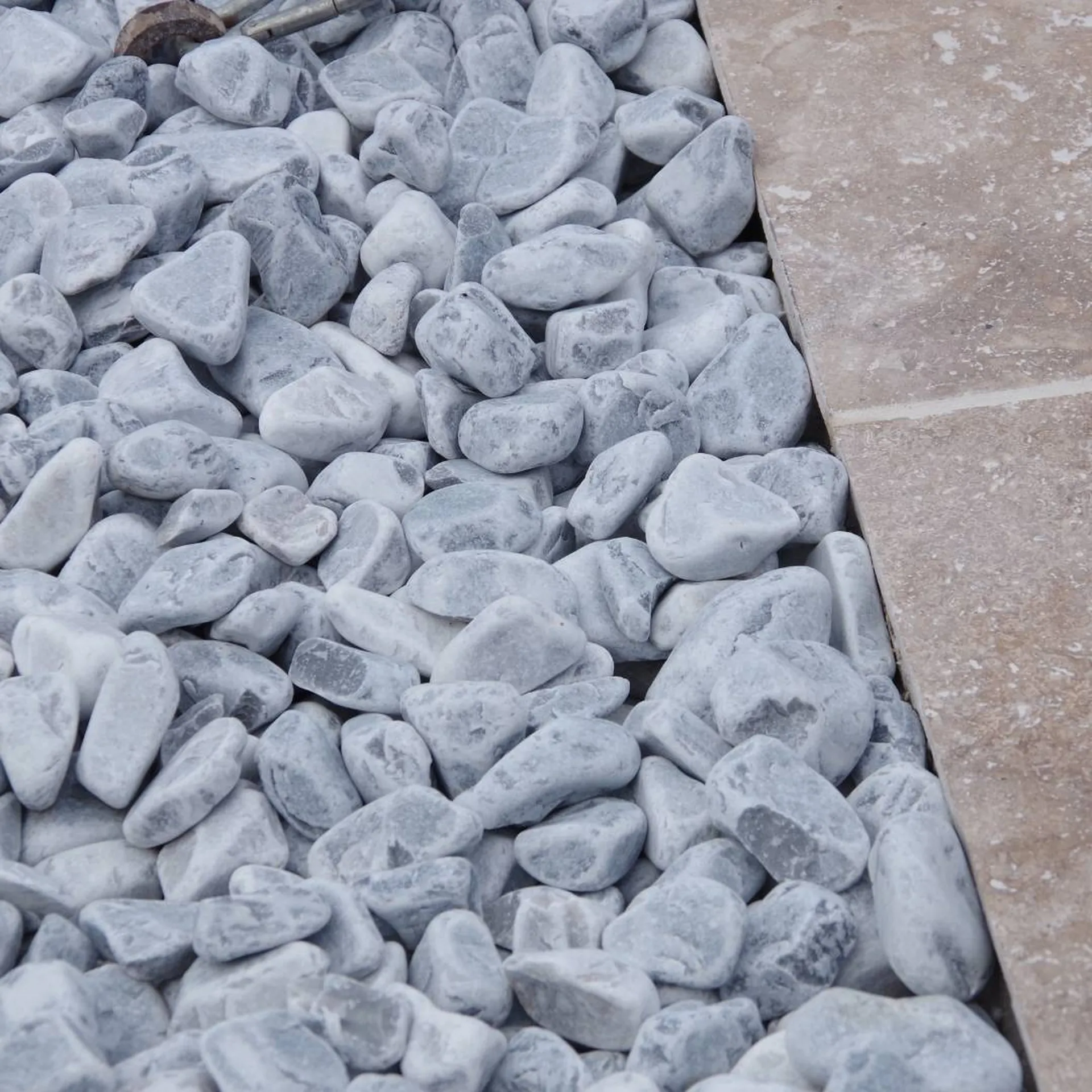 Pour ce projet, nous avons utilisé des galets gris bleu roulés en 30/60 pour habiller avec élégance la périphérie de la terrasse. Leur teinte naturelle et leur finition lisse apportent une touche contemporaine à ce jardin.
