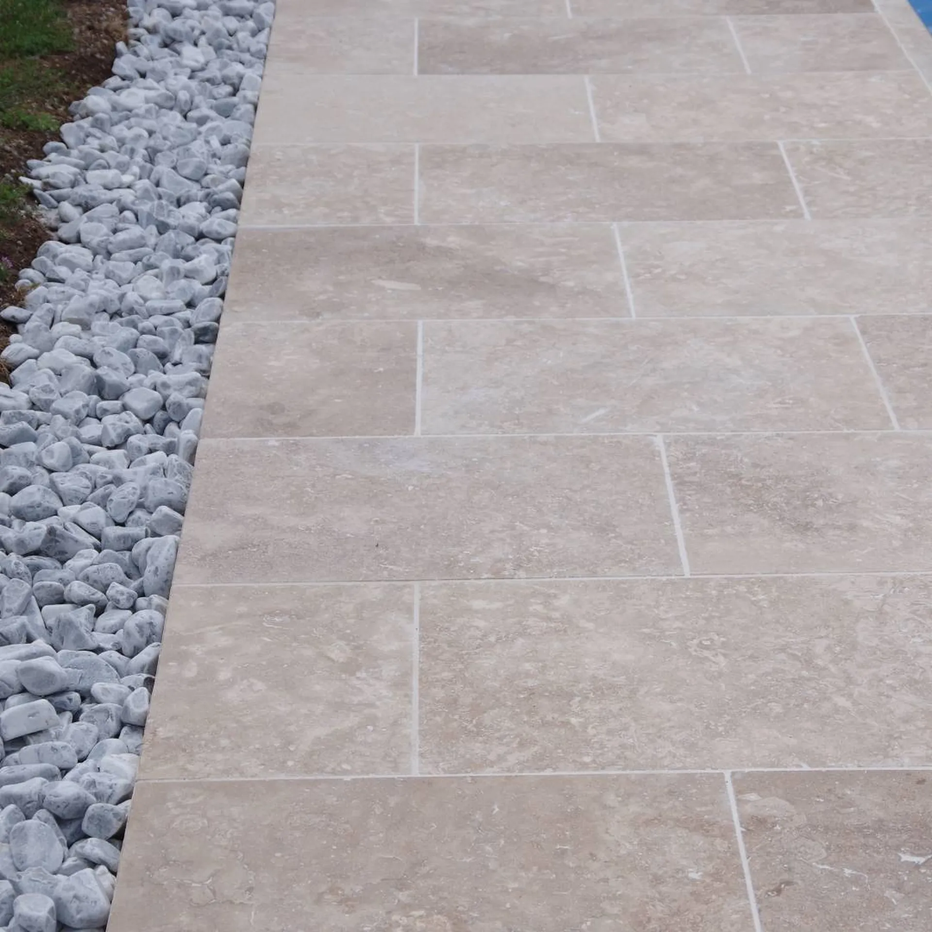 La terrasse, quant à elle, a été conçue en pierre naturelle. Du travertin Mix Premium au format 40,6 x 61 x 1,2 cm, un matériau intemporel, choisi pour sa résistance et son rendu chaleureux. Pour garantir une durabilité maximale face aux intempéries et aux taches, le travertin a été hydrofugé, assurant ainsi une protection optimale contre l’humidité.