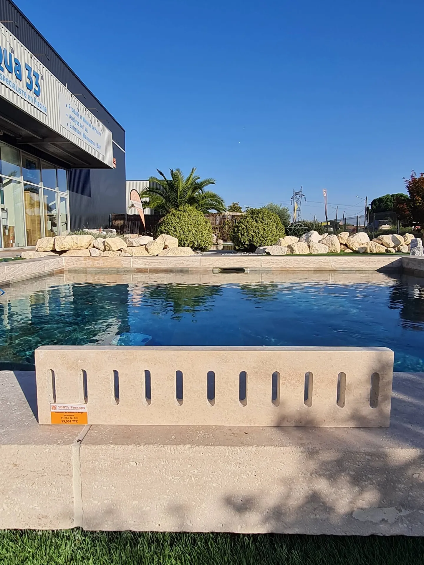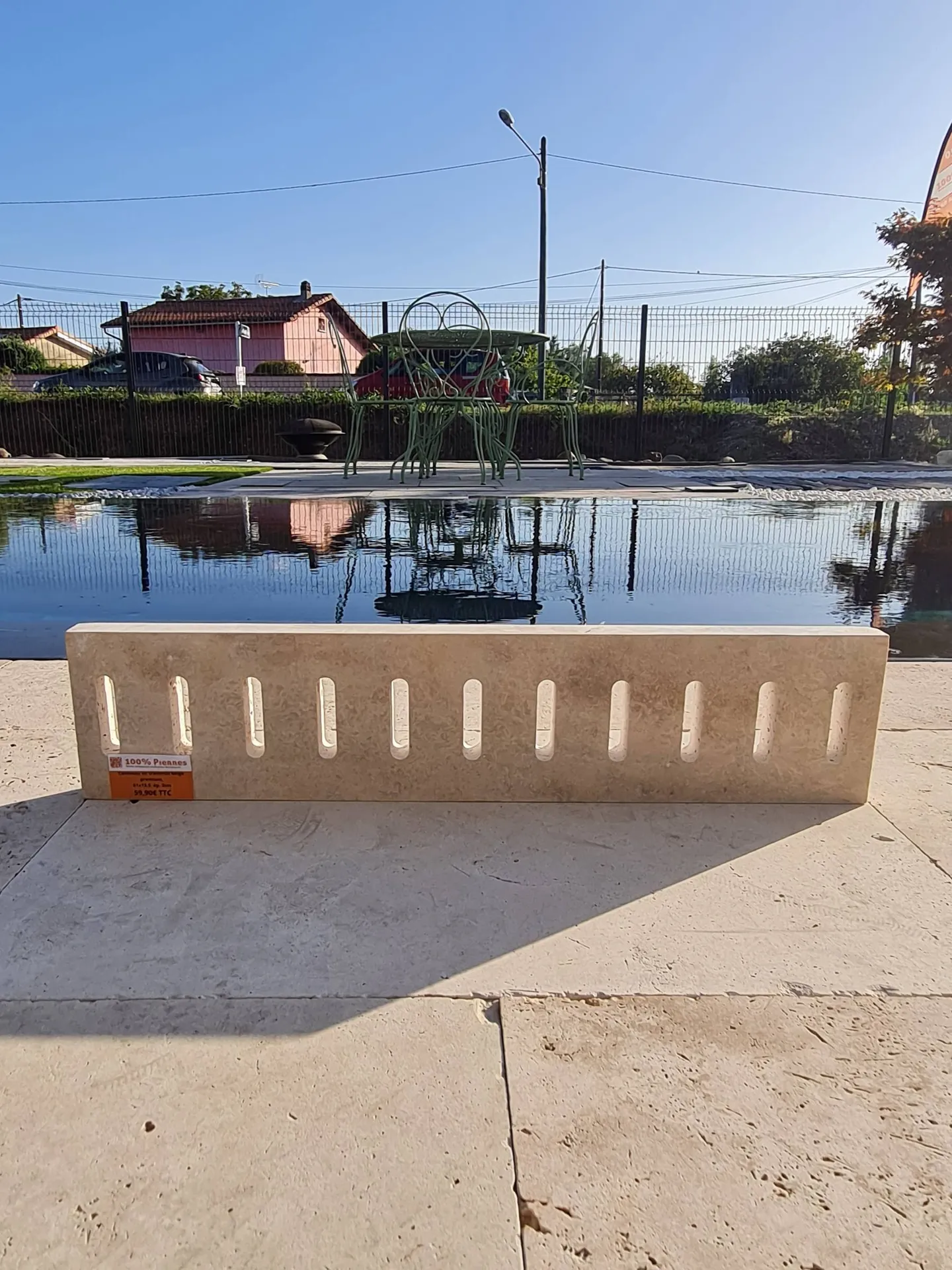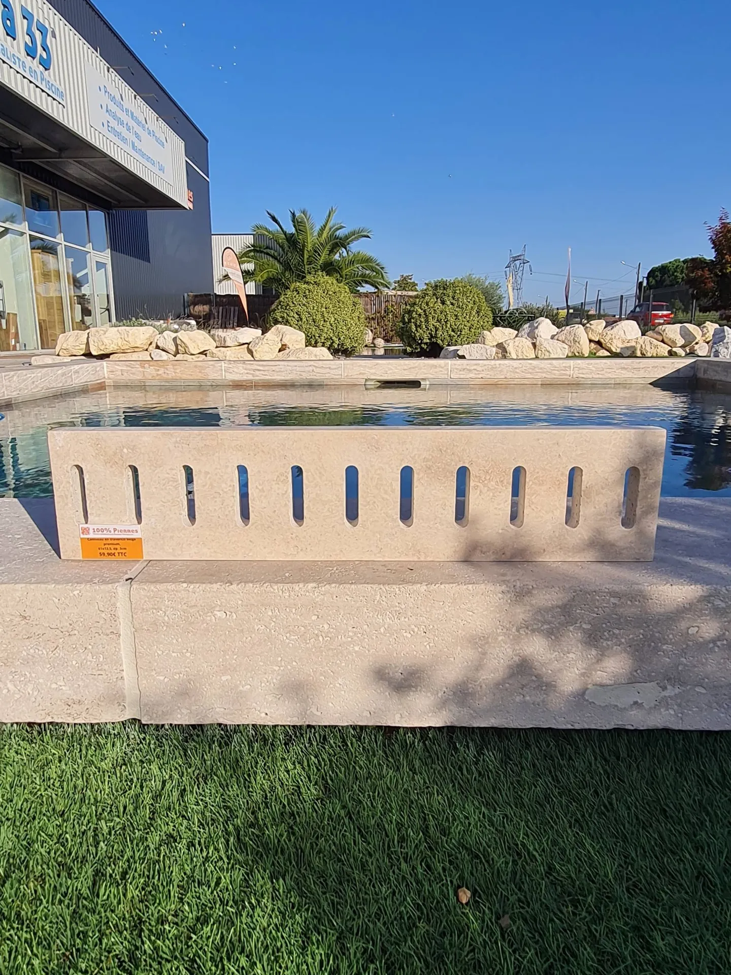 Dans votre showroom d'Ambarès et Lagrave, 100% Pierres commercialise des caniveaux en pierre naturelle de travertin. Le format standard est de 61x13,5x3cm.