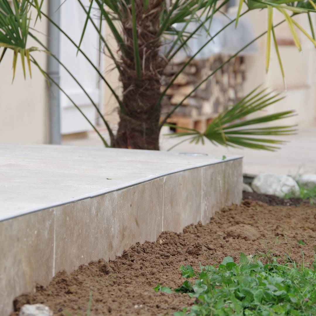 Pour ce projet, notre cliente a choisi le travertin mix en format 40,6 x 61 x 3 cm, un matériau naturel et robuste, parfaitement adapté aux aménagements extérieurs. Grâce à sa texture unique et à ses teintes chaleureuses, le travertin apporte une élégance intemporelle à tout espace, tout en garantissant une durabilité à long terme.